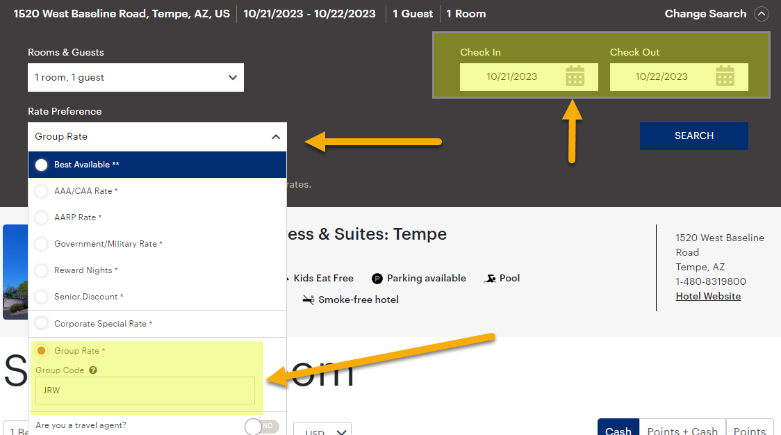 You can use the link below to book a room out of our block and receive the discount or you can book directly from the IHG page. If you are going to book directly from the IHG page, make sure to select Group Rate in the Rate Preference drop-down and enter the code: JRW